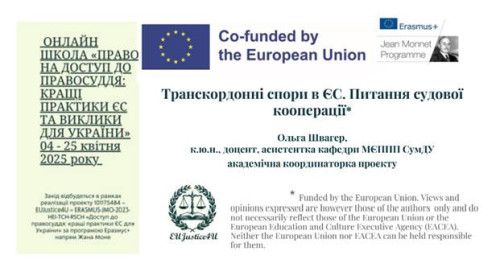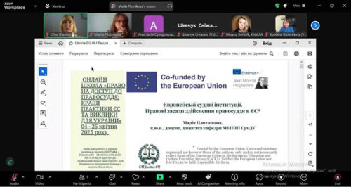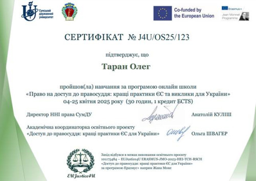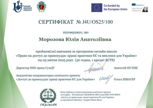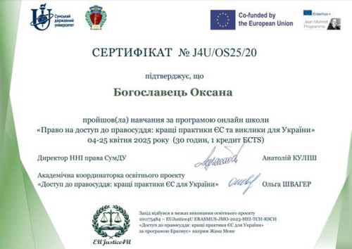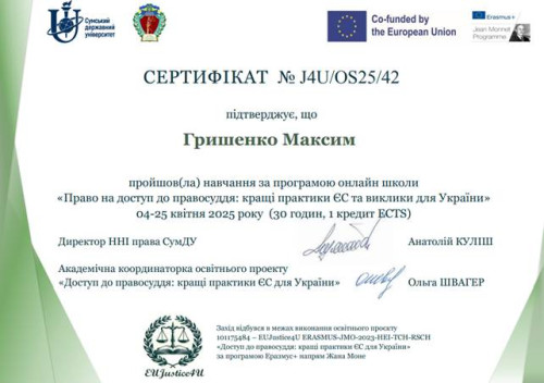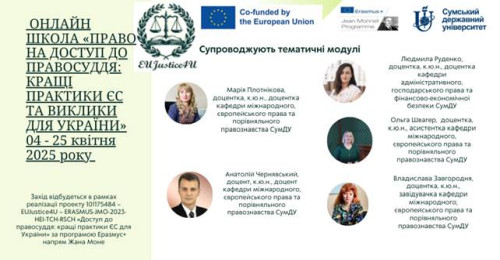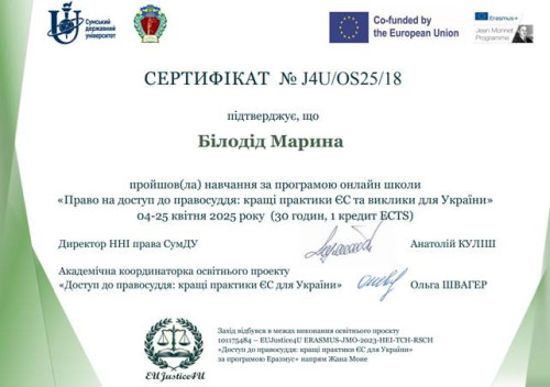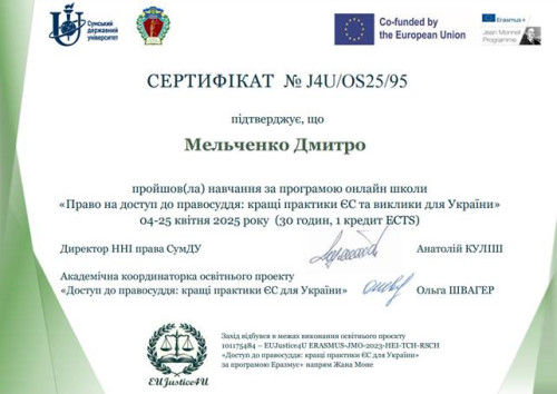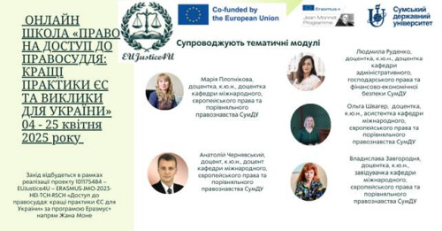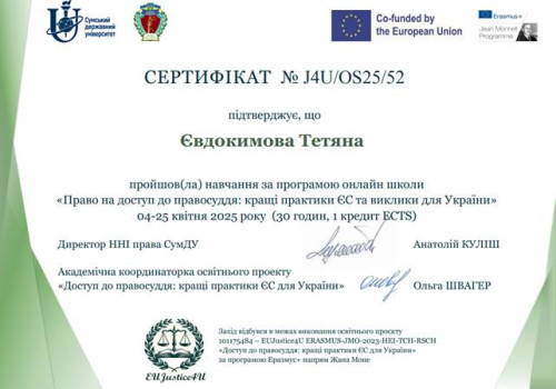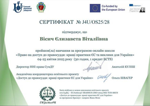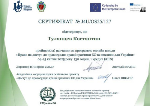 Здобувачі відзначили належний рівень організації заходу, високий професіоналізм лекторів та практичну значущість отриманих знань для подальшої правозастосовної діяльності. За результатами проходження курсу учасникам видали сертифікати (1 кредит ЄКТС, 24 години аудиторної та 6 годин самостійної роботи). Бажаємо здобувачам у подальшому ефективно реалізовувати набуті знання й уміння у сфері захисту прав людини, удосконалювати навички правозастосування та сприяти розвитку вітчизняної правової системи відповідно до європейських стандартів. У період з 4 по 25 квітня здобувачі 3 курсу спеціальності D8 Право долучились до онлайн-школи «Право на доступ до правосуддя: кращі практики ЄС та виклики для України», організованої на базі Навчально-наукового інституту права Сумського державного університету. Захід відбувся в рамках реалізації проєкту 101175484 – EUJustice4U – ERASMUS-JMO-2023-HEI-TCH-RSCH «Доступ до правосуддя: кращі практики ЄС для України» за програмою ЄС Erasmus+, напрям Жана Моне. Метою школи було ознайомлення учасників із сучасними європейськими підходами до забезпечення права на справедливий суд, з урахуванням як загальноєвропейських стандартів, так і специфіки національного правового поля. Учасники онлайн школи дізнались про кращі практики ЄС в сфері доступу до правосуддя, пропрацювавши такі тематичні модулі:
