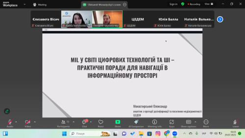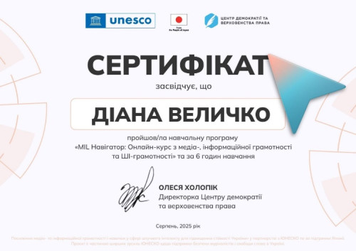 Другим етапом зустрічі було формування рекомендацій щодо покращення обізнаності населення, зв’язку між державою та суспільством. Учасниці та учасники знову поділилися на три команди і по черзі формували власні пропозиції. Єлизавета висловила власні думки також. Після жвавого обговорення представниці команд оголошували рекомендації. Серед них: висвітлення позитивної практики (наші громадяни будуть бачити, що держава в особі її органів та посадових осіб може захистити й підтримати їх. Це також сприятиме довірі населення до держави); можливість надсилати смс на 102 (для людей з порушеннями функції зору та слуху це стане справжньою можливістю на отримання допомоги); спільне навчання поліції, адвокатів, прокурорів та інших (це сприятиме обміну інформацією, поглядами, практиками та сприятиме кращому виявленню проблем та вчасному реагуванню); правопросвітницькі заходи (громадяни зможуть краще дізнатися як захистити себе, куди звертатися за допомогою тощо). Насамкінець організатори подякували учасницям та учасникам за участь, підбили підсумки. Сформовані рекомендації будуть належним чином оформлені та запропоновані правоохоронним органам. Зустріч фахівчинь з різних сфер сприяла обміну досвідом, думками, поглядами тощо. Ми почули домку психологів, як вони взаємодіють з потерпілими та які постають перед ними виклики. Дійшли думки, що варто на законодавчому рівні закріпити обов’язок держави надавати психологів потерпілим. Адже дітям така можливість надається, а для дорослих нажаль ні. Єлизавета дізналася багато чого нового, обмінялася з фахівчинями досвідом, думками. Ця зустріч стала чудовим прикладом того, як держава та суспільство мають об’єднуватися аби разом долати перешкоди. Наші громадяни здатні впливати на законотворчість, обговорювати нові виклики, створювати та розвивати справедливе суспільство в Україні. Дякуємо організаторам за насичену та цікаву зустріч, яка неодмінно сприятиме покращенню взаємодії між фахівцями-практиками, державою та суспільством! ЯК ОТРИМАТИ БЕЗОПЛАТНУ ПЕРВИННУ ПРАВНИЧУ ДОПОМОГУ В ПОЛТАВСЬКОМУ УНІВЕРСИТЕТІ ЕКОНОМІКИ І ТОРГІВЛІ12 вересня 2025 року в рамках позакредитного курсу «Університетська освіта» в Полтавському університеті економіки і торгівлі було проведено бесіду зі студентами першого курсу щодо діяльності Навчального юридичного центру «Правова СТУДіЯ» Полтавського університету економіки і торгівлі (далі – юридичного центру). Вісич Єлизавета, завідувачка юридичного центру, розповіла здобувачам про можливість отримати безоплатну первинну правничу допомогу. Також, Єлизавета розповіла про правопросвітницькі заходи, які були проведені нею та клініцистами. Наостанок здобувачі дізналися про шляхи звернення за безоплатною правничою допомогою. Здобувачі проявляли активність і зацікавленість. Бажаємо студентам гарних оцінок, натхнення та щасливого студентського життя! ШТУЧНИЙ ІНТЕЛЕКТ ТА МЕДІА-ПРОСТІР АБО ЯК НАВЧИТИСЯ ВІДРІЗНЯТИ ФЕЙКИЗдобувачі вищої освіти спеціальності 081 «Право» Величко Діана, Вісич Єлизавета та Мунтяну Юрій взяли участь у навчальній програмі – «MIL Навігатор: онлайн-курс з медіа-, інформаційної та ШІ-грамотності». «MIL Навігатор: онлайн-курс з медіа-, інформаційної та ШІ-грамотності» реалізовується Центром демократії та верховенства права в межах п